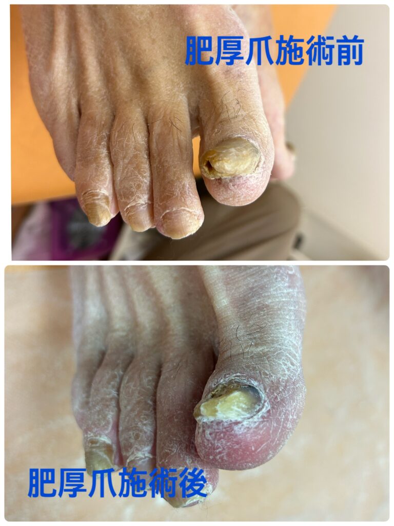 A: もちろんです。肥厚爪や変形爪で厚く硬くなった爪こそ、プロの技術が必要です。特殊な器具を用いて、患者さんの負担なく、安全に本来の厚み・形へと整えていきます。諦めずにご相談ください。
