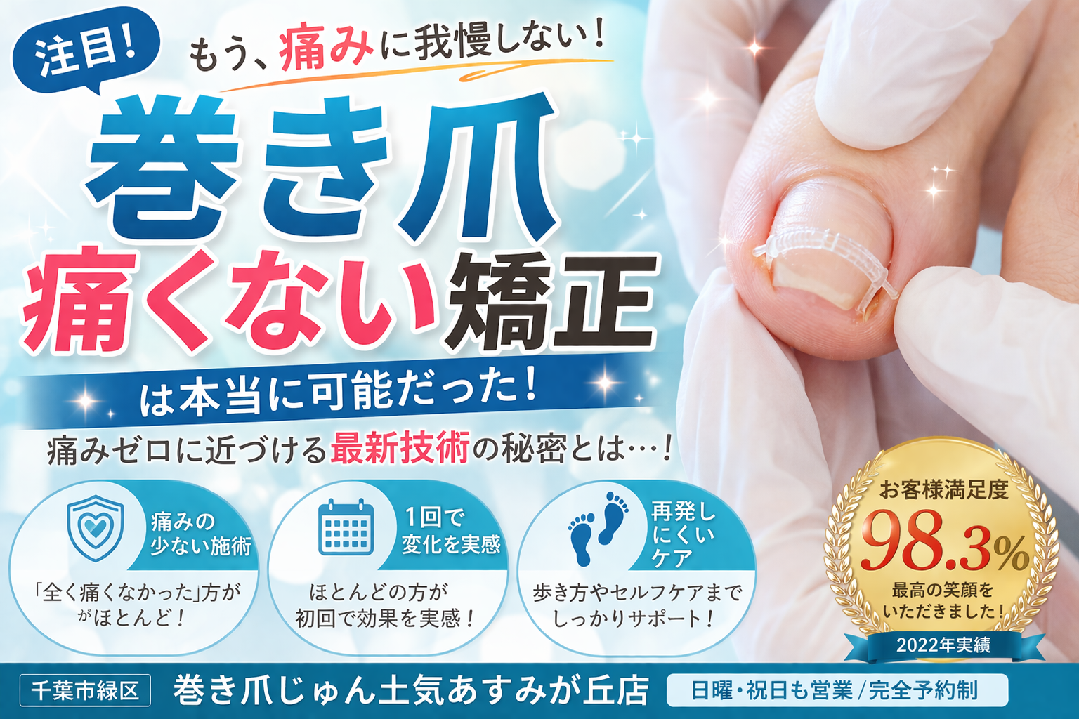 巻き爪 痛くない矯正は本当にできるのか?原因・種類・改善方法を徹底解説。千葉市緑区の巻き爪じゅん土気あすみが丘店の施術の特徴や痛みの少ない理由、再発防止まで詳しく紹介します。