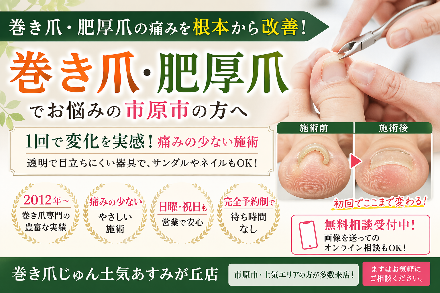 巻き爪 肥厚爪で歩くたびに痛い、爪が厚く切れないとお悩みの市原市の方へ。原因・対策・再発予防を徹底解説。巻き爪じゅん土気あすみが丘店が初回変化と痛みの少ない施術でサポートします。
